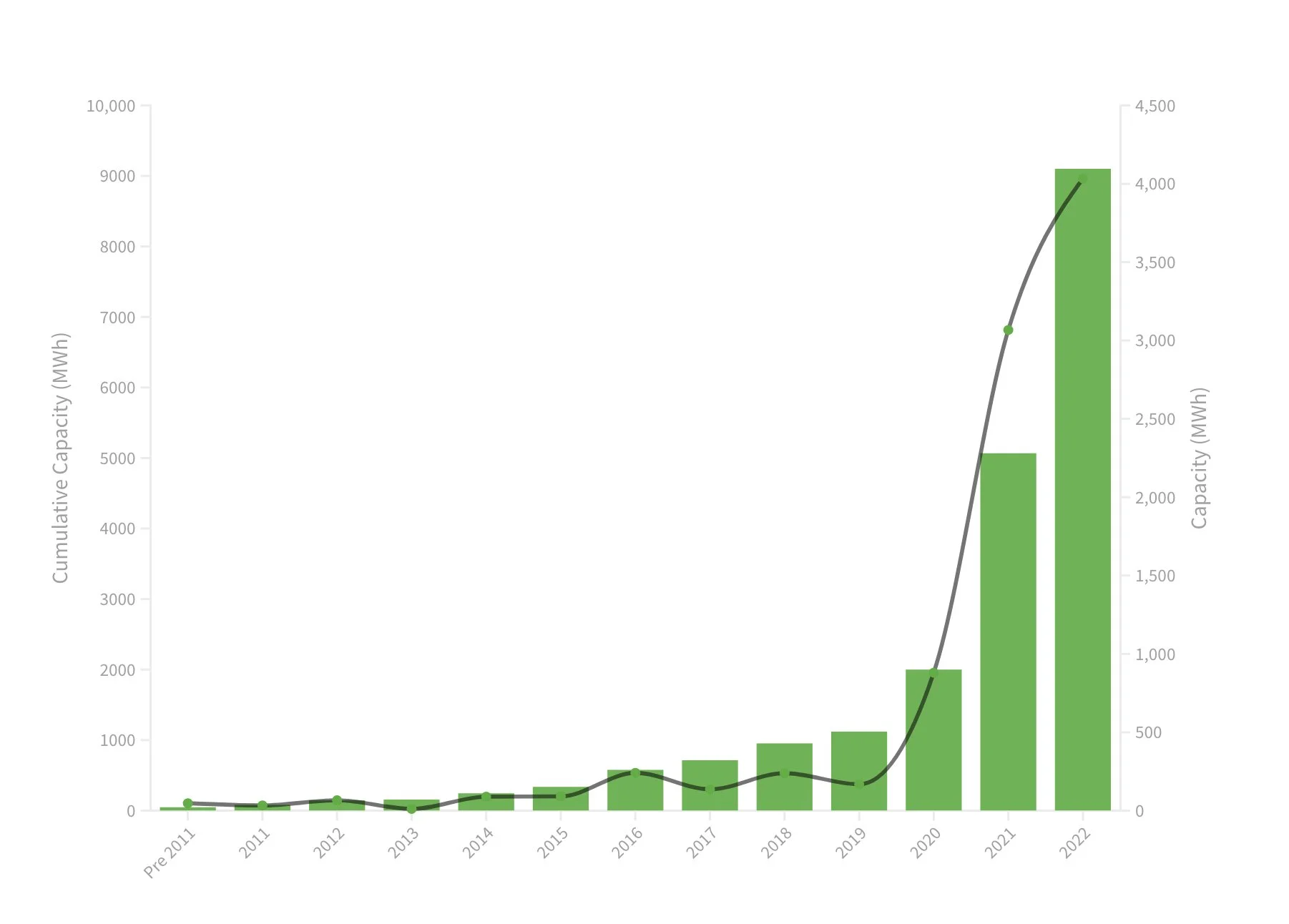 2022 was a record year for battery storage, with 4,034 MW/12,149 MWh commissioned. [See ACP]