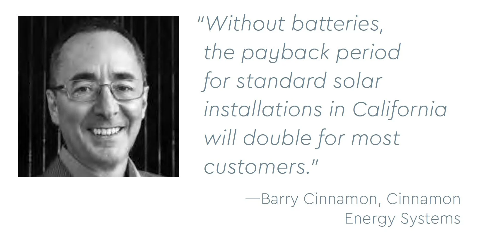 “Under the Net Billing Tariff, solar customers get reimbursed for excess power at the ‘avoided cost’ rate, which is less than $0.05 per kWh—and often zero—during peak daytime generation hours,” explains Barry Cinnamon, CEO of Cinnamon Energy Systems. “Without batteries, the payback period for standard solar installations in California will double for most customers. Adding one or more batteries increases up-front costs but recovers some savings from the loss of net metering by reducing solar exports and increasing self-consumption.”